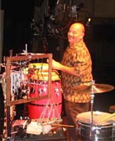 そして「Black Diamond」からの2曲目、「Angelfire」。フラメンコ調で始まるこの曲、なんといっても速いリズムに乗ったRussのメロディアスなギターが印象的だ。しかし、この曲の見所はなんといってもドラムのDaveとパーカッションのScottのソロ合戦だろう。アルバムでもドラムとパーカッションがかなりフィーチャーされているが、ライブではそれがさらにパワーアップする。そして、このドラムとパーカッションのソロ合戦は、ここ最近のライブでは定番になりつつあるようだ。着実にリズムを刻むDave、そのインプロビゼーションは非常にパワフルだ。それに相対するのがベテランのScott。デビュー当時のパーカッショニスト、Steve Reid(スティーブ・リード)のような派手さはないが、渋くきっちり決めるといった印象で、どちらかというと前パーカッショニストのRamon Yslas(ラモーン・イズラス)に似た、独創的でじっくりと聴かせるタイプと言えるだろう。そして、中でもハイライトはScottの「フライパン」でのインプロビゼーション。手馴れた手つきでフライパンを扱い、驚くほどバラエティに富んだ音を作り出す。この勢いでサニーサイドアップ(目玉焼き)でも作っているとしたら、相当腕の立つ料理人だろうが、その辺りはいまだ未確認。次回のライブでは、知的かつ音楽的な質問に加えてぜひこのことも聞いてみよう。 ・・・といったところで、「みんなありがとう!」とメンバーは退場。以前ご報告したニューポートビーチ・ジャズフェスティバルの時と比べると格段に曲数は多いが、でもやはり「もっともっと聴きたい」というのがファンの本音だ。学生達の怒号のような歓声に2階席後部の我々長年のファンの拍手と歓声が加わり、ほどなくメンバーが再登場!そこで始まったのが、もちろんこの曲「Tourist In Paradise」。 このパターンは本当に長年変わっていない。Russ自身もあまり変える意志がないのかもしれない。Rippingtonsがブレイクするきっかけとなった同名のアルバムのまさにテーマ曲であり、その後のRuss自身の人生を大きく変えることになった象徴的な曲ともいえる。ギターにサックスにドラムにキーボードに、そしてパーカッションがはじけるような勢いで会場に響き渡り、観客は1階席も2階席も大喜びだ。ここで光ったのが、今回「ハンサムでかっこいい」Ericのソロだ。力強い高音に骨のあるリフ、ジャズなのだがロックする熱いソロが続く。そしてRussのギターも、ロックグループのヴォーカリストがシャウトしているかのようなパワフルな音を響かせる。このあたり、Rippingtonsを単なる「スムースジャズのバンド」にカテゴライズできない所以でもある。