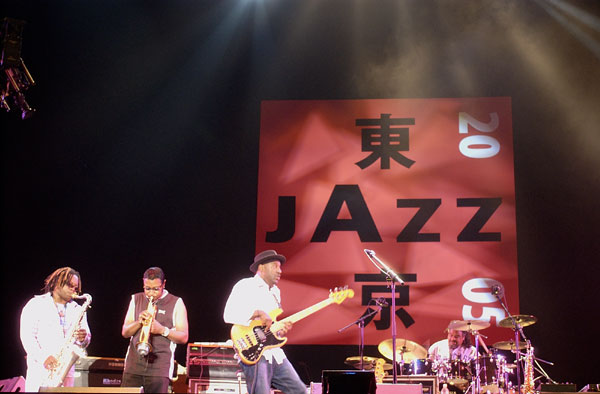 東京Jazzに出演するミュージシャンは予測の範囲内の人もいる一方、まさか彼らが出るなんてと驚かされる人も居ます。 今回のマーカス・ミラー出演には、驚きと同時に狂喜した人も多かったのではないでしょうか。 まさに満を持しての登場となったマーカス・ミラーですが、実は前の日のヘッドハンターズの一員として一足先に出演していたわけです。 そして翌日は自分のバンドを率いての演奏と、ある意味でハービー・ハンコックに次ぐ忙しさになったこの2日間だったのではないかと想像します。 準備に手間取り、ややスタートが遅れたのですが、待ち遠しかったファンから大きな拍手と声援が飛びます。 さすがにマーカス、1曲目から惜しみのないベースワークを楽しませてくれます。 それにしても今更ながら、なんと力強いベースワークだろうと感心します。スラップももちろんなのですが、フィンガーピッキングでのベース音もびんびんに客席に伝わってきます。 また、タッピングにしてもマーカスはいとも簡単にやってのけるので、本当に現在NO.1ベースマスターであることを実感します。 パッチェス・スチュワートのEVI(SAX向けがEWIに対し、トランペッター向け)もなかなかで、ソロではエフェクトをかませたユニークな演奏を聴かせてくれました。 それと今回参加してキース・アンダーソンはテナーSaxを吹き、今までマーカスのバンドはアルトSax奏者ばかりなのでテナーは如何に?と思いましたが、なかなかこれがサウンドになじんでいました。 また、ディーン・ブラウンの「待ってました」のギター・ソロも冴えてます。凄いのか、凄くないのか分からなくなってしまうほど(笑)、白熱した凄みを魅せてくれました。 演奏曲はもうマーカス・ミラー・バンドといえばのおなじみの曲ばかり。 ここのところ衛星放送やDVDでよく見るレパートリーなのですが、流石に生で聴くと一味も二味も違う感じですね。 また、新作シルバーレインからの曲もレパートリーとしてなじんでいて、フランケンシュタインやパワー・オブ・ソウルと、また新たにマーカス・サウンドに魅力が加わったと感じました。(TKO) |
